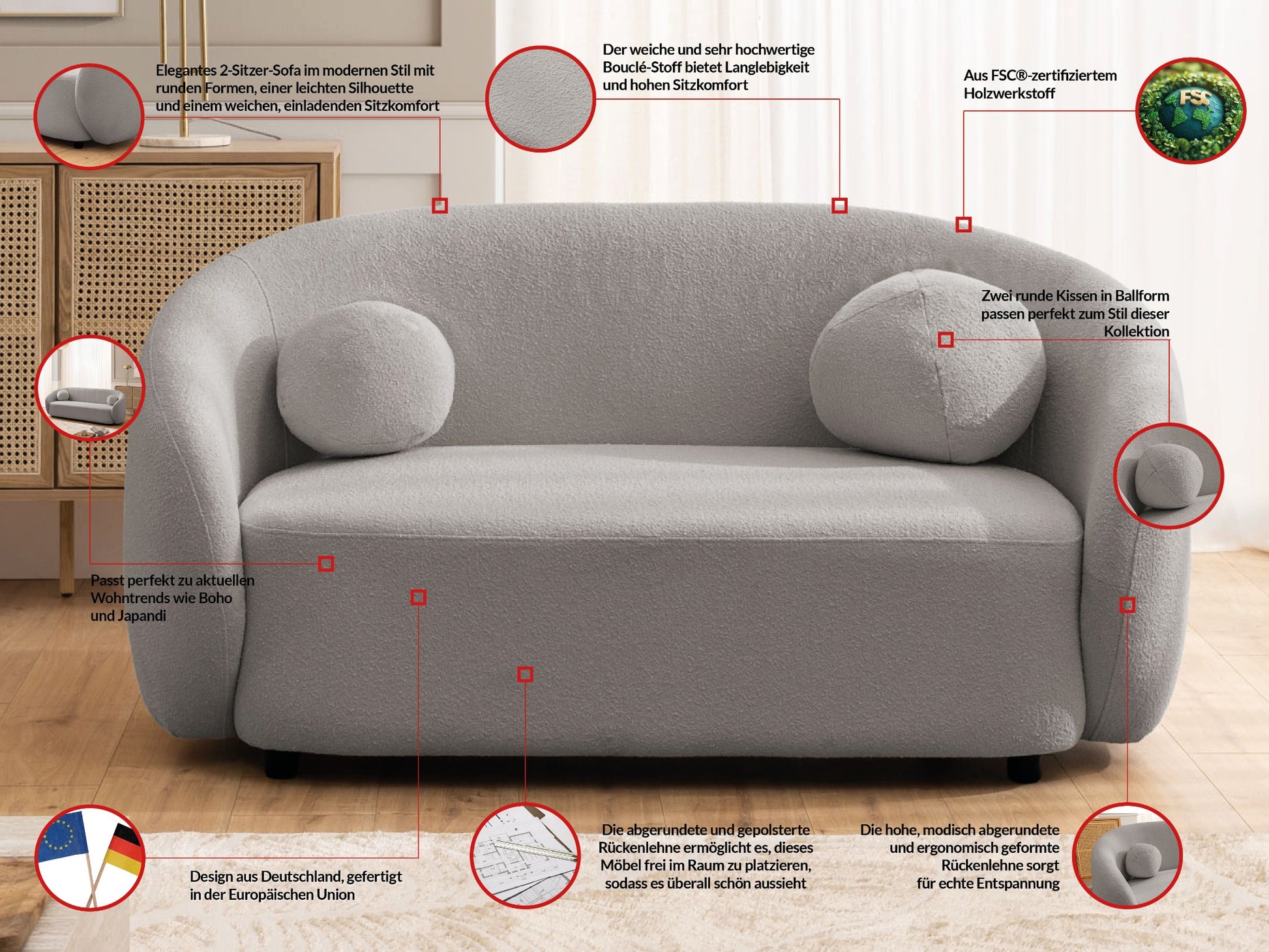 Bloom 2er Sofa - Modernes Bouclé-Sofa - Grau