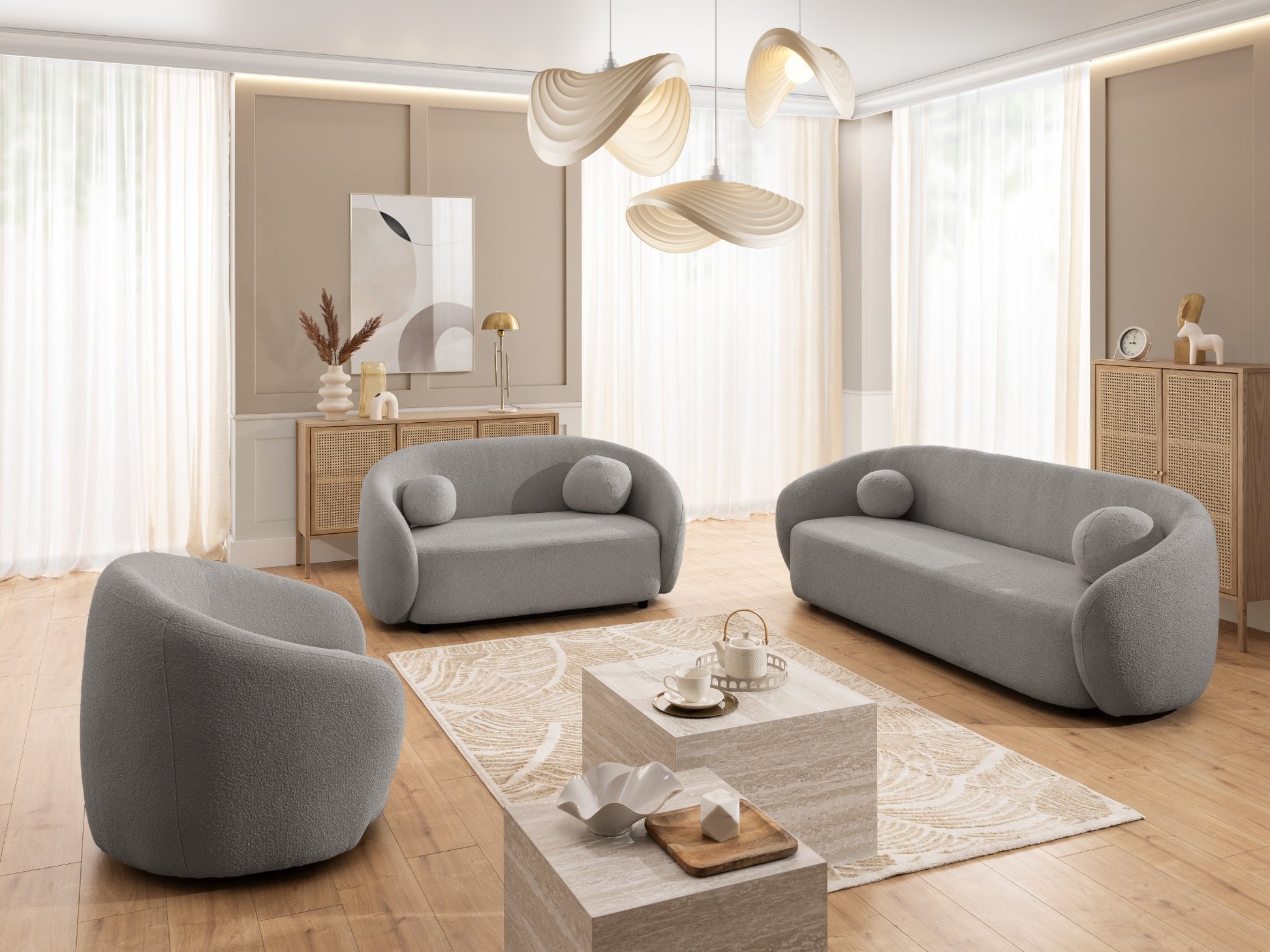 Dieses Bouclé-Sofa entfaltet eine sanfte, organische Eleganz, die jeden Raum sofort veredelt. Die geschwungenen Linien wirken wie aus einem Guss und verleihen dem Sofa eine beruhigende, fast skulpturale Präsenz. Der edle Bouclé-Stoff umhüllt die Form mit einer warmen, weichen Struktur, die zum Berühren einlädt und ein Gefühl von Geborgenheit vermittelt. Die großzügige Sitzfläche und die runden Kissen schaffen einen Ort, an dem man ankommt, loslässt und sich vollkommen entspannen kann. Getragen von einem stabilen, dezent schwebenden Unterbau verbindet dieses Sofa Luxus, Komfort und zeitlose Ästhetik – ein Stück, das Räume nicht nur ergänzt, sondern emotional bereichert.