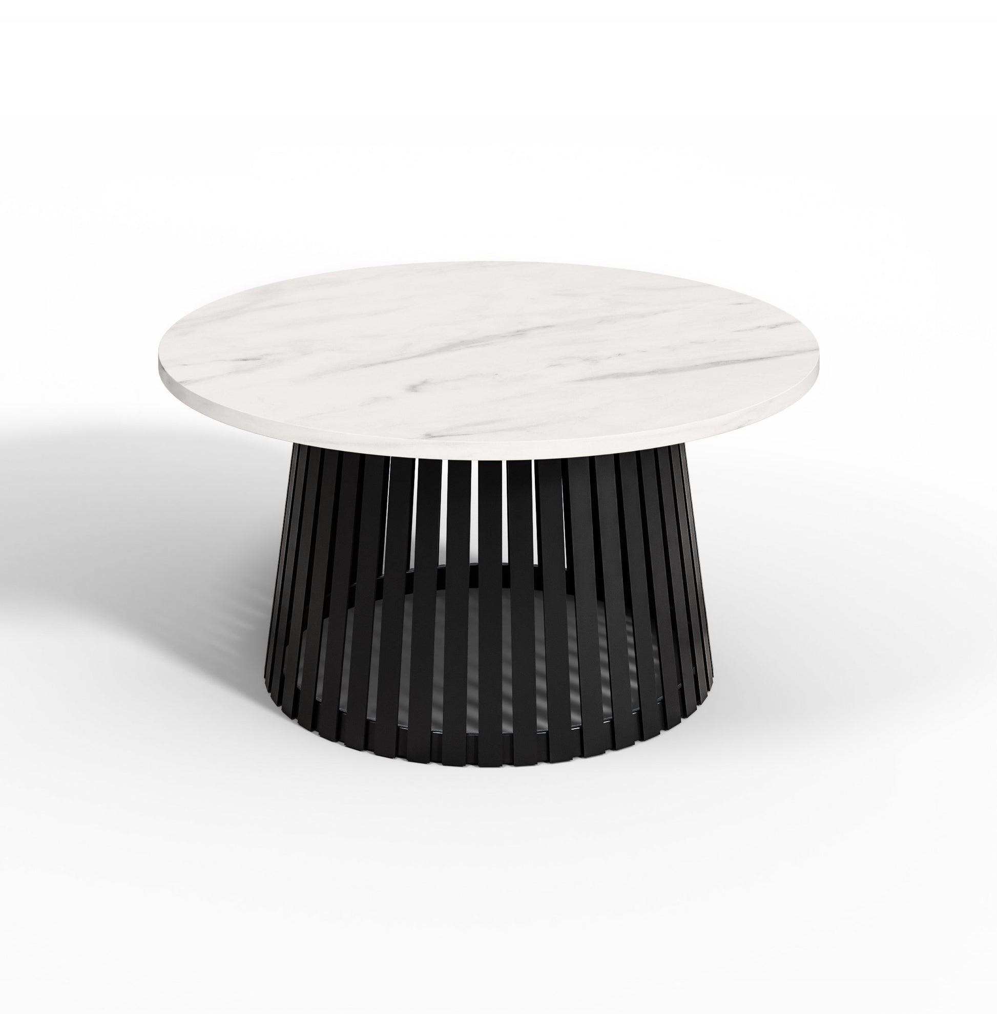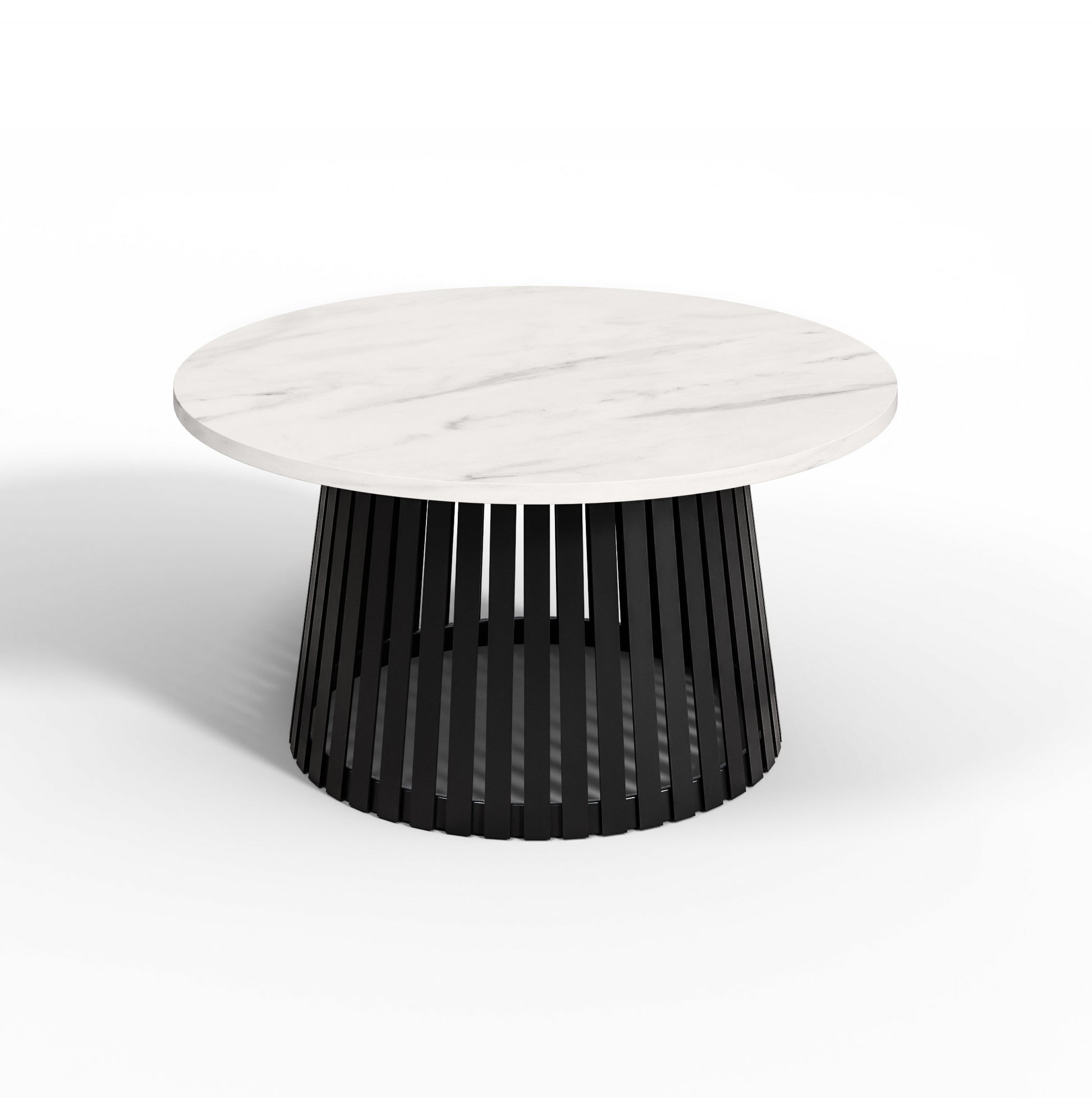 Der Couchtisch ABEL vereint zeitlose Eleganz mit einem ausdrucksstarken Design. Die runde Tischplatte mit edler Marmor-Optik sorgt für eine hochwertige, ruhige Ausstrahlung und setzt stilvolle Akzente im Wohnraum. Getragen wird sie von einem markanten, schwarzen Untergestell aus vertikalen Metallelementen, das dem Tisch seine skulpturale Form und besondere Tiefe verleiht.